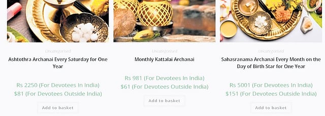 The fake website appears to have options and information similar to the official website. A window pops up on the landing page with a link ‘Order Pooja Now’. When the link is clicked, it leads to more links with options like Monthly Kattalai Archanai (special prayer), Ashtothra Archanai (prayer for every Saturday for one year) and Sahasranama Archanai (prayer for every month on the day of birth star for one year). The website charges Rs 981, Rs 2,250, and Rs 5,001, respectively, for devotees in India, and $61 (Rs 5,355), $81 (Rs 7,110), and $151 (Rs 13,256), for devotees outside India.