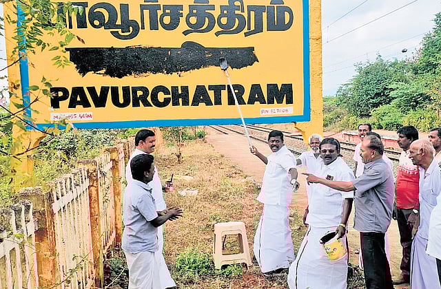 DMK’s Tenkasi North district secretary and MLA E Raja, along with other DMK functionaries, painted over Hindi letters on Sankarankovil railway station’s name board, while former DMK South district secretary P Sivapadmanathan and his supporters did the same at the Pavoorchatram railway station.