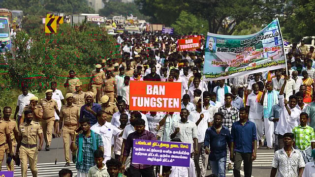 MADURAI: Seeking the union government to cancel the Tungsten mining project in the district, protestors on Tuesday started a rally from Narasingampatti village towards the head post office in Tallakulam in Madurai city. The rally has been temporarily halted in Mattuthavani before it resumes in the afternoon.