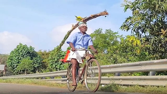 Chellathurai's act of “love”, he said, began ever since his daughter Sundarambal, now 44, gave birth to twins after 12 years of marriage. Including coconuts, turmeric, rice, jaggery, flowers, calendar and new clothes in the ‘seer’ that also comprised five sugarcane pieces he separately balanced on the head, Chellathurai pedalled off to Nambampatti, where his daughter resides, on Tuesday too.