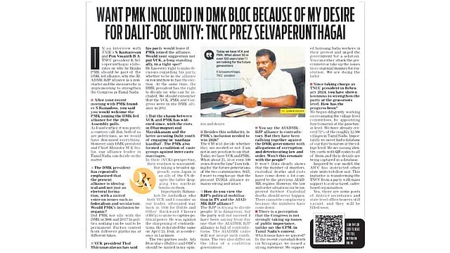 CHENNAI: Tamil Nadu Congress Committee (TNCC) president K Selvaperunthagai’s remarks in an interview to TNIE on Friday, reiterating his preference for the inclusion of PMK in the DMK-led INDIA bloc for the 2026 Assembly polls, have drawn sharp criticism from within the Congress and its ally VCK.