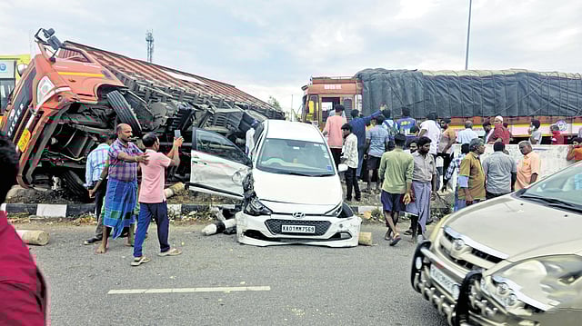 At the time, a flour goods-laden lorry from Bengaluru heading to Tiruchy, driven by R Purushothaman (59) of Cuddalore, arrived at the spot. Purushothaman allegedly put the vehicle on neutral gear (a practice done to save fuel), due to which the lorry dashed forward in the sloping road, resulting in the vehicle pile-up. Anwar Basha and his son, who were travelling from Bengaluru to Bargur on a bike with his wife and daughter, were killed on the spot.