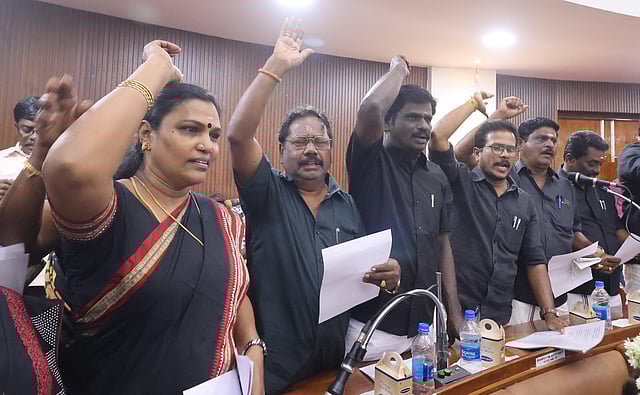 With both sides exchanging heated arguments, Indirani directed police personnel to escort the opposition councillors out of the council hall. Tuesday's was the first meeting after all five zonal chairpersons and chairpersons of two standing committees resigned in the wake of the tax fraud scandal. All the resigned members did not attend the meeting.