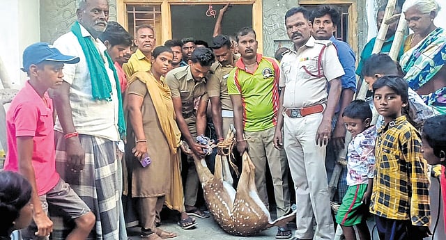 KARUR: A two-year-old spotted deer which wandered off from a reserved forest near Vadacheri into Veeranampatti village was chased by stray dogs and took refuge inside a house on Saturday morning.