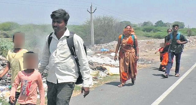 TIRUVANNAMALAI: Stranded in a town without jobs, around 50 migrant families hailing from Maharashtra were spotted walking for nearly 95 km to cover the stretch between Villupuram and Kalampur railway station on foot. The families, comprising over 120 men, women and children, were spotted near Arani on Thursday.