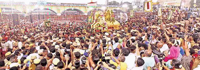 MADURAI: The much-awaited event of the annual chithirai festival – Lord Kallalagar entering the Vaigai river – took place on Monday morning. Adorned in green silk (to mark prosperity in agriculture) and mounted on a golden horse vahanam, Kallalagar entered the river at 5.48 am as hysterical crowds chanted “Govinda, Govinda” and loudspeakers blared ‘Vararu Vararu Alagar Vararu’ song from the Vijayakant-starrer Kallalagar, rendered by Deva.