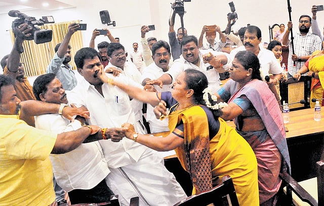 Condemning the assault on Yadavamoorthi, AIADMK members sat in front of the mayor’s chair and held a ‘dharna’ demanding disciplinary action against Sugashini as well as another woman councillor, M Pachiammal of the 35th ward, for punching Yadavamoorthi on his chest as she came in support of Sugashini.