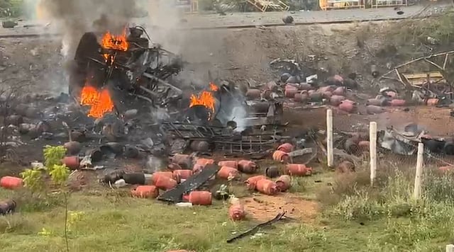 ARIYALUR: A lorry carrying hundreds of LPG cylinders overturned and exploded on the Attur–Thanjavur National Highway (NH 136) on Tuesday morning, resulting in a massive fireball and a series of blasts that shook the surrounding area. Approximately 80 cylinders exploded in the incident, which occurred near Varanavasi in Ariyalur district.