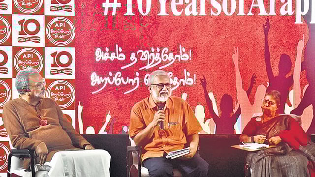 A panel discussion on ‘Arappor’s role in social change over the last 10 years and their road ahead’ featured Singer and writer TM Krishna, lawyer and activist Sudha Ramalingam, Henri Tiphagne from People’s Watch, Kalpana Karunakaran (IIT-M professor), Siddharth Prabhakar (journalist), and Raju Murugan (filmmaker), moderated by PUCL national secretary Suresh.