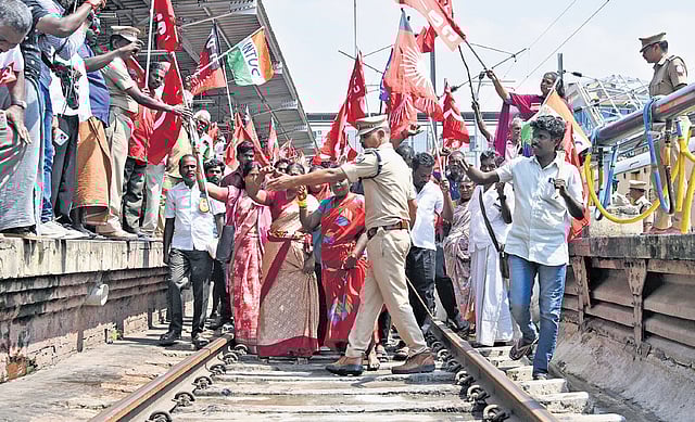 CHENNAI/COIMBATORE/MADURAI/TIRUCHY: Backing the nationwide general strike called by central trade unions and farmers’ organisations, constituents of the INDIA bloc – including the Left parties, DMK, Congress, and VCK – and trade unions staged protests across Tamil Nadu on Thursday, alleging that the BJP-led union government is pursuing “anti-labour and anti-people” policies.