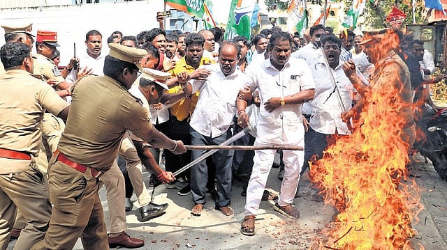 In retaliation, over 100 Congress functionaries assembled near the BJP’s office on Saturday and marched towards the premises. The protest was led by state Congress president V Vaithilingam and former CM V Narayanasamy.