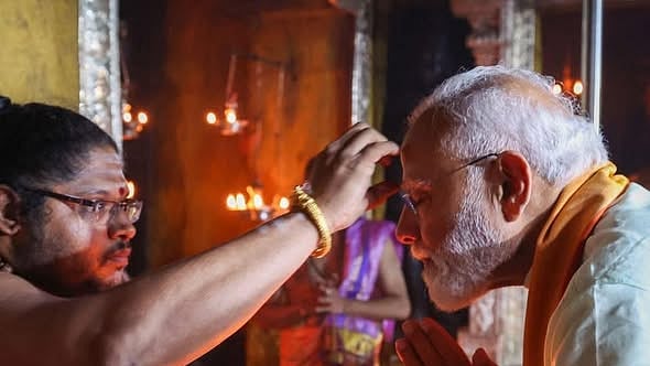 After offering prayers for nearly 30 minutes, Modi left for a public meeting, where he said, “I prayed for prosperity of Tamil Nadu and for the nation during my visit to Thiruparakundram temple.”