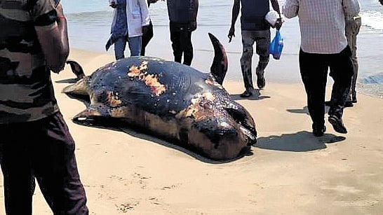 The discovery comes a day after another short-finned pilot whale was reported to have washed ashore along the same stretch in an injured condition. Eyewitnesses had claimed that the whale appeared alive, with its tail and fins moving. However, before forest personnel could secure the animal, the tides pulled it back into the sea.