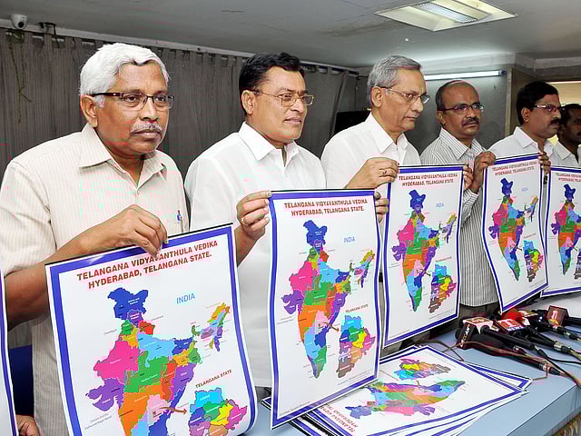 HYDERABAD: Telangana Vidyavanthula Vedika released the model of Telangana state map and how it will look on the India map, at the Press Club, Somajiguda, here on Tuesday. The official map will take some time to be released. The model map was released by TJAC chairman M Kodandaram, TNGO president Deviprasad Rao, TJAC leader Mallepalle Lakshmaiah and senior journalist Ramachandra Murthy. Speaking on the occasion, Kodandaram said the Telangana map is released to identify the new state in India map and to indicate its geographical boundaries with neighbouring states. He said Telangana state lies at the centre of India and will act as a transit zone for states like Maharashtra, Karnataka, Chhattisgarh and Odisha in respect of trade and commerce. Telangana, by its geographical location, has all the possibilities to emerge as a textile hub, he said and emphasised the need for improving road infrastructure for enabling better transportation links with other states. “Road infrastructure in Warangal, Karimnagar and Adilabad need to be improved,” he said. Kodandaram said along with Pranahitha project, bridges should be constructed over Godavari river for connecting Telangana with Maharastra and Chhattisgarh in a better manner. “The area between Ramagundam and Kagaznagar should be developed as an industrial belt. The map is also important for creation of new districts and delimitation of constituencies.” TNGO president Deviprasad said finally the long cherished dream of Telangana people got realised. “Now, the task it rebuilding it and proving wrong the criticism that small states are not viable. When we say development, we don’t mean creating some infrastructure and buildings. Development means improving the living standards of everyone.” Telangana Vidyavanthula Vedika president Mallepalle Lakshmaiah, who published the map said though official version of the map will take time, they wanted to bring out a model of the political map and show the people how our new state looks on the map of India. Senior journalist Ramachandra Murthy and BJP leader Surabhi Bhooma Rao spoke.