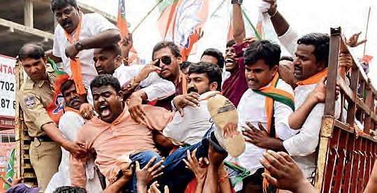 Addressing a gathering at Collectorate blockade organised by district BJP on Monday with a demand to observe Liberation Day officially on September 17, he said at the time of Rosaiah’s chief ministership, KCR wanted Hyderabad Liberation day to be observed officially and now he went back on his own words under pressure from Majlis. He also said police are acting in favour of the ruling party and filing false cases against Opposition.