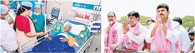 Congress party candidate in Khammam Renuka Chowdhury visits Vanajeevi D Ramaiah, a man undergoing treatment after he was injured in a road accident in Khammam; (right) Telangana Rashtra Samithi candidate in Khammam Nama Nageswara Rao, outgoing Parliame