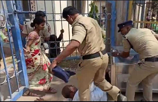 A little earlier, her father, S Chandrasekhar, with the help of ABVP activists, took the body out of the mortuary of the hospital and was trying to take it out of the hospital to stage a protest against the Narayana College, whose student she was, when the police began taking the body back into the hospital.