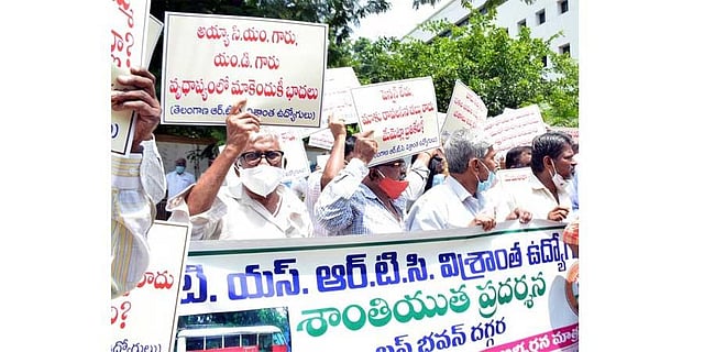 HYDERABAD: “In this ripe old age, I never thought that I would take part in a demonstration in front of the head office of the corporation I had served for almost 34 years. Since no one is taking forward our cause, we had to take matters into our own hands,” said a retired TSRTC employee during the demonstration held at Bus Bhavan on Monday.