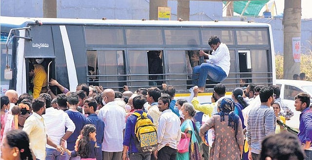 As there is no parking space on the hillock, all vehicles are being made to park at the foot of the hillock. From there, RTC buses have been arranged to ferry devotees to the temple atop the hillock. As there is a waiting time of 30-40 minutes between every bus, buses are going packed with devotees who are being ferried like flock of sheep in the blistering hot summer.