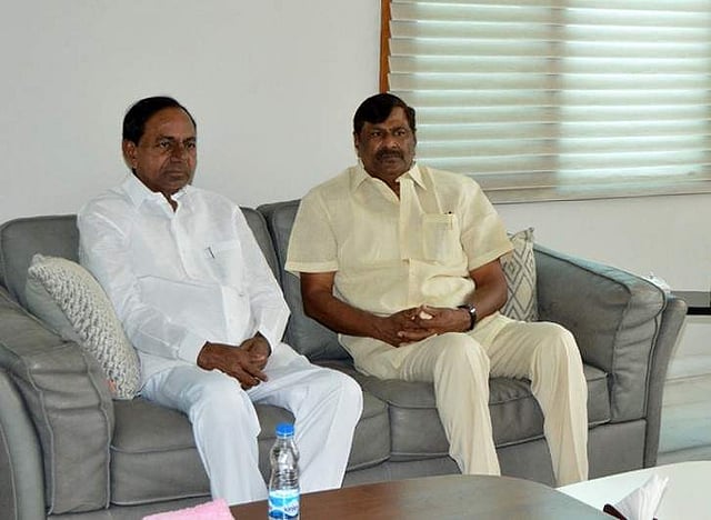 TRS chief K Chandrasekhar Rao with TDP leader Mandava Venkateshwara Rao on Friday (Photo | EPS)