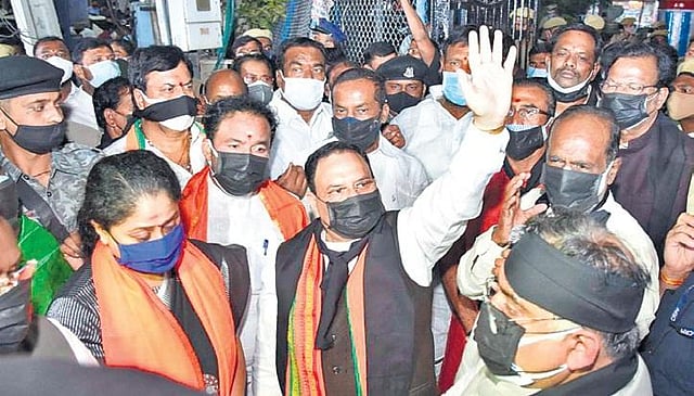 When a reporter asked what would he do if the police arrest him, he said let them do it first, which made people wonder if there was going to be a showdown. As the convoy of Nadda’s cars moved on from the airport, more number of police forces were deployed at Mahatma Gandhi statue and along the route through which the rally was proposed to go through, to prevent Nadda, in case he decides to defy police orders and lead the procession.