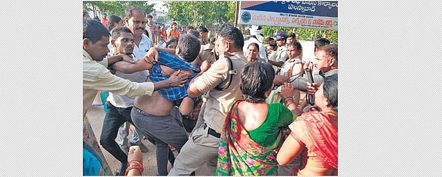 SIDDIPET: A day after the police unleashed a reign of terror against the residents of Gudatipalli which would be submerged once the Gouravelli Reservoir is built in the district, it was the turn of the TRS workers to bear down on the defenceless people on Tuesday, and beat them up mercilessly while they were staging a protest on Siddipet-Hanamkonda road in Husnabad. The protesters gathered MLA V Satheesh’s camp office, seeking fair compensation for their lands.