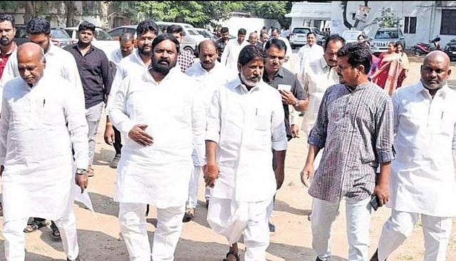 Mallu Bhatti Vikramarka and other senior Congress leaders arrive at Gandhi Bhavan to attend a seminar on the Constitution Day on Saturday | RVK Rao