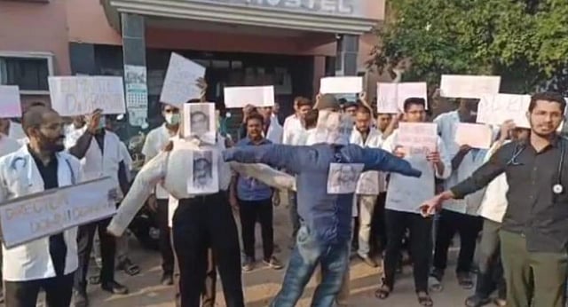 ADILABAD: In a shocking incident at the Rajiv Gandhi Medical Sciences (RIMS) campus, chaos erupted as outsiders, allegedly aided by Assistant Professor Dr A Kranthi Kumar, attacked junior doctors, leading to a student protest and the burning of the assistant professor’s effigy in the district headquarters on Thursday.