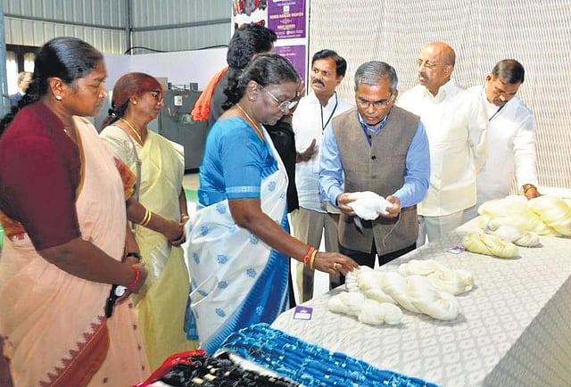 YADADRI-BHUVANAGIRI : President Droupadi Murmu commended the efforts put in by Pochampally Ikat weavers in the handloom sector, appreciating them for passing on the art to the next generation. Ministers Thummala Nageswara Rao, Dansari Anasuya (Seethakka), government whip Birla Ailaiah, central textile secretary Rachna Shah, state handloom secretary Alugu Varshina, and collector Hanumanthu Jandage welcomed the President during her visit to the Bhoodan Pochampally town in Yadadri Bhuvanagiri dstrict on Wednesday as part of her annual southern sojourn.