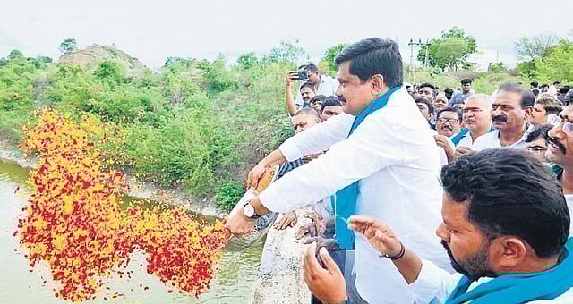 To celebrate the arrival of water to SRSP, locals and members of the Bharat Rashtra Samithi (BRS) organised celebrations at various places in the Balkonda Assembly constituency on Thursday. Roads & Buildings Minister Vemula Prashanth Reddy participated in the celebrations, conducting special pujas on flood flow canal bridges at several villages between the SRSP and Kammarpally Mandal.