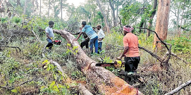 Before cutting the trees, a specialised marking team, comprising five members, numbers and tags each tree. These tags are carried forward to the logs, which are transported to specific licenced timber depots. The logs will remain securely stored under high-security measures until they are sold through an open auction, said Yadav.