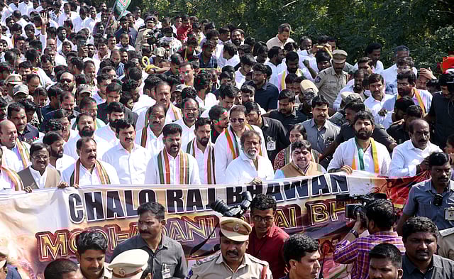 The protest, led by the Chief Minister along with his ministerial colleagues, MLAs, MLCs, and hundreds of supporters, demanded a JPC probe into the alleged financial irregularities involving the Adani Group. The massive rally culminated outside Raj Bhavan after the Telangana Assembly was adjourned until 3 PM on Wednesday.