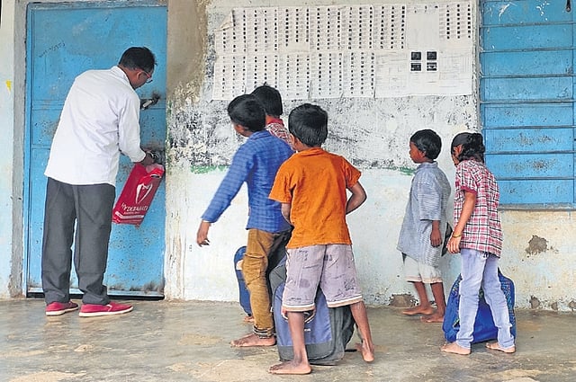 In another single-teacher school in Jainoor mandal, of the 15 enrolled students, only six were present. Several were absent, engaged in cotton collection with their parents or attending the last rites of a person from a nearby village. The lone teacher, requesting anonymity, mentioned that another teacher was recently deputed to the school. Despite the challenging circumstances, everyone entered the classroom, sidestepping a dead puppy on the stairs. Later, one of the students was tasked with its disposal.