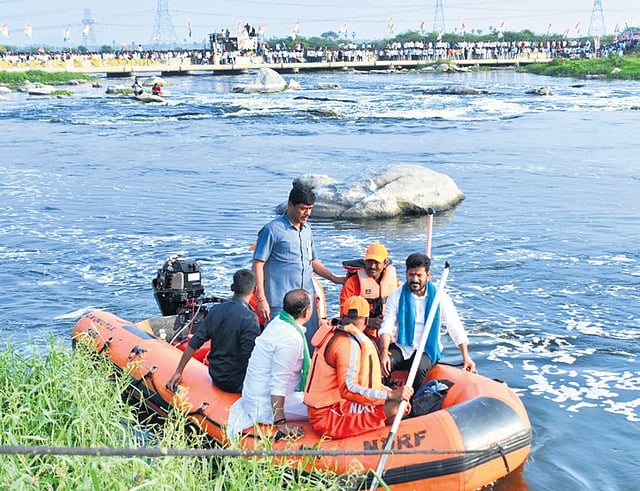 He was speaking after undertaking a 2.5 km padayatra from Sangem temple after performing pujas to Bhimalingeswara Swamy to create awareness among the people on the Musi rejuvenation project. The chief minister also undertook a short boat ride to take a close look at the polluted water of the Musi. Revanth collected a sample of the water in a bottle and took it with him.