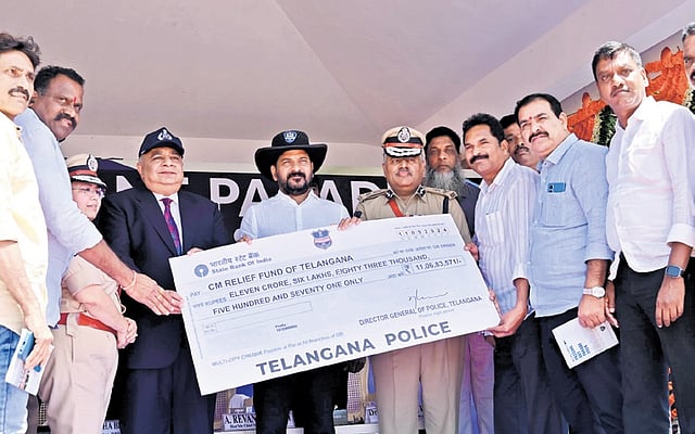 Telangana police on Wednesday donated Rs 11.06 crore to the CMRF as a measure to support those affected by the recent floods in the state. The fund, which is equivalent to one day’s salary of the state’s police personnel, was handed over to the CM during the passing-out parade of SIs on Wednesday.