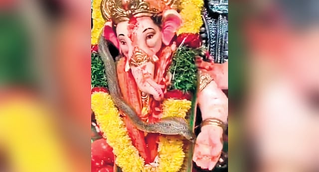 The organisers were busy with pooja and other preparations to take the Ganesh idol in a procession for immersion after the completion of nine-day festivities when the reptile found its way into the mandapam.