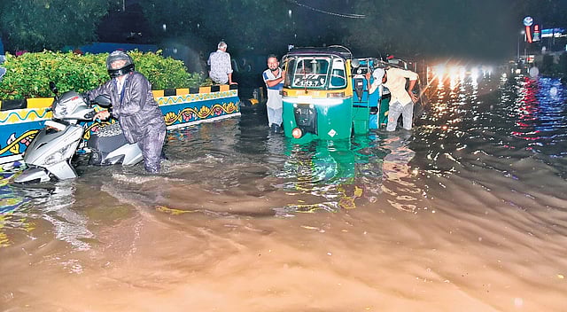 Traffic came to a near standstill on arterial roads. Commuters faced long delays on stretches such as Biodiversity Junction to IKEA, Mindspace to Cyber Gateway and Dallas Road. Approaches to the Raidurg Metro station were choked as commuters were seen with vehicles moving through knee-deep water.