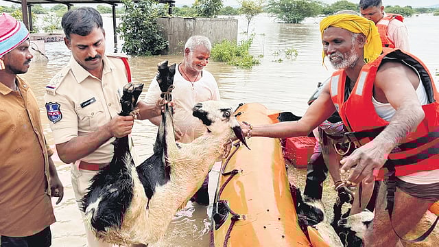 Heavy rains in Mulugu on Monday inundated Mangapet and Kamalapur villages, forcing residents to seek shelter on rooftops. MRO T Ravinder and local police rescued 60 people and shifted them to a rehabilitation centre. The overflowing Jeedi Vagu and Gowraram Vagu cut off access to interior areas. Minister Danasari Anasuya (Seethakka) directed officials to vacate unsafe houses. Police barred tourists from Yedu Bavulu waterfall in Mahbubabad, where a youth was washed away earlier.