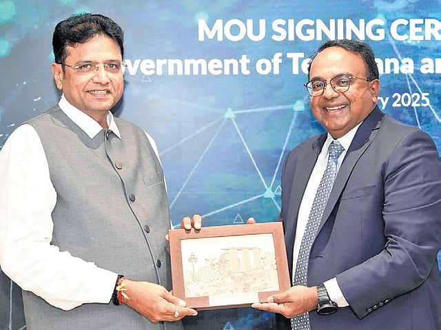 The MoU was signed in the presence of IT and Industries Minister D Sridhar Babu, Special Chief Secretary, IT and Industries, Jayesh Ranjan, TGIIC MD Shri Vishnu Vardhan Reddy and Bruno Lopez, Group CEO of ST Telemedia Global Data Centres (STT GDC), at the STT GDC office in Singapore.