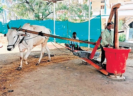 KARIMNAGAR: People in Karimnagar are turning to the old tradition of extracting oil: grinding groundnut and sesame seeds in a wooden mortar and pestle. This is because people want to avoid using mass-produced oils to take care of their health.