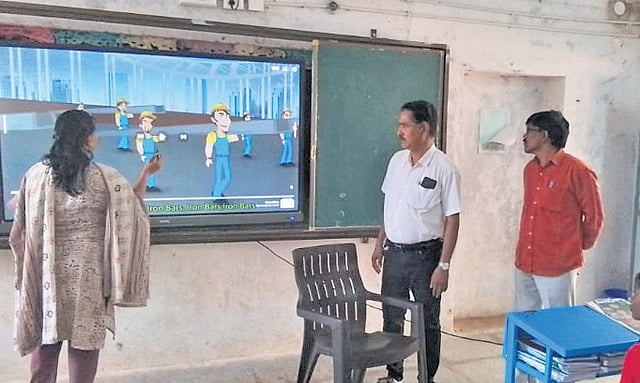Fifth-grade students from Ramojipet Primary School, accompanied by headmaster B Sudhakar Sharma, visited the high school. They toured various facilities, including the kitchen, laboratories, library, playground, reverse osmosis (RO) water plant, computer room and digital classrooms. Teachers demonstrated how lessons are delivered using panel boards and other digital tools.