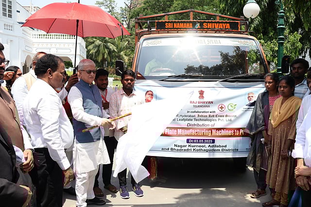 HYDERABAD: Governor Jishnu Dev Varma flagged off vehicles carrying machinery for manufacturing ecofriendly leaf plates and cups to tribal villages, under a project funded through the governor’s discretionary grants, at Raj Bhavan on Saturday.