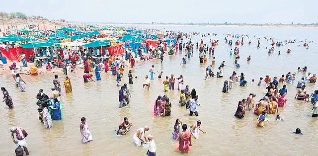 BHUPALPALLY: On the third day of the ongoing Saraswati Pushkaralu at the Triveni Sangam in Kaleshwaram, thousands of devotees thronged the Pushkar Ghat, turning the riverbank and roads into scenes reminiscent of the recent Maha Kumbh Mela. With the weekend rush, devotees performed sacred rituals and took holy dips in the river.
