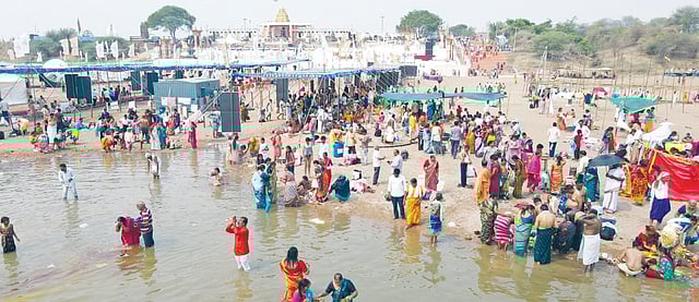 BHUPALPALLY: Kaleshwaram witnessed a massive influx of devotees on Sunday, the fourth day of Saraswati Pushkaralu, as over 1.5 lakh pilgrims from Andhra Pradesh, Karnataka, Maharashtra and Chhattisgarh took holy dips at Triveni Sangam.