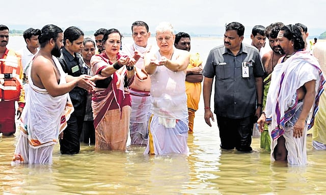 Telangana Governor Jishnu Dev Varma visited the Saraswati Pushkaralu Ghat and took a holy dip at the Triveni Sangam, where the rivers Godavari, Pranahita, and Saraswati are believed to converge. He also offered special prayers and performed spiritual rituals at the revered site. Later, the Governor visited the Kaleshwara Mukteeshwara Swamy temple and offered prayers to Lord Shiva.