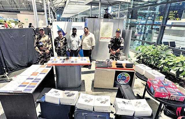 HYDERABAD: CISF personnel at the Rajiv Gandhi International Airport (RGIA) intercepted two passengers arriving from Abu Dhabi and seized smuggled DJI drones and Apple products worth approximately `1.4 crore.