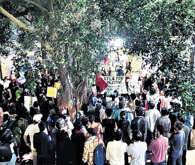 The EFLU administration had denied permission for the “Palestine Solidarity March” scheduled for 6 pm on Tuesday, stating that such events were against national interest. The university also objected to banners reading “EFLU is with Palestine” and the display of Palestinian flags. An inquiry into the incident will be conducted in accordance with university ordinances and regulations.