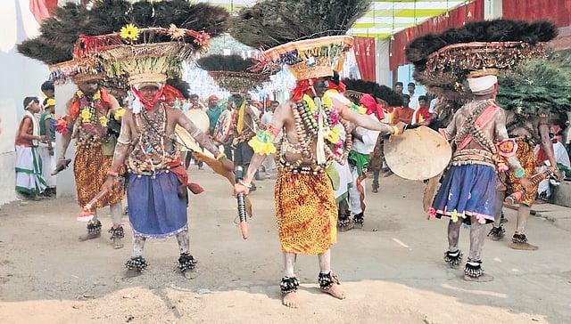 The Adivasi community celebrates for 15 days, a week before and a week after Diwali, with large gatherings, performances by Gussadi troupes and traditional rituals.