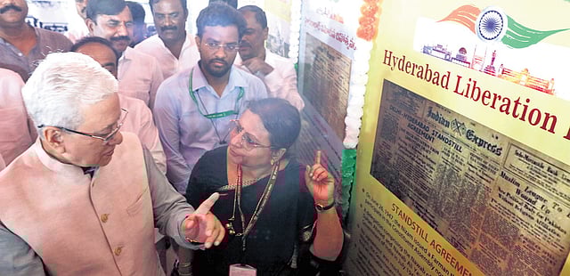 As the Centre is set to celebrate the Telangana Liberation Day at Parade Ground, the Governor, along with Union Minister G Kishan Reddy, inaugurated a photo exhibition on the merger of Hyderabad with the Indian Union in September 1948.