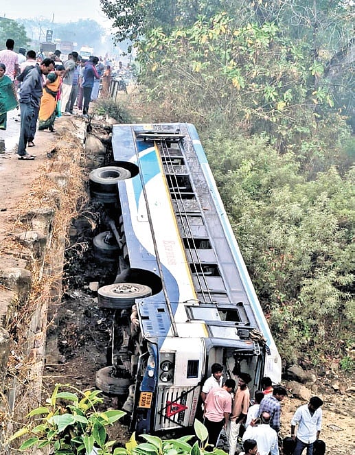 The passengers boarded the bus from Asifabad depot and were en route to Adilabad. Near Shyampur village, the driver was unable to properly judge a vehicle approaching from the opposite direction on a narrow bridge. He slowed down and steered the bus to the left, but as the bridge had no side walls, a tyre slipped off the edge. The driver then lost control, causing the bus to fall. Passengers, including the driver and conductor, sustained injuries.